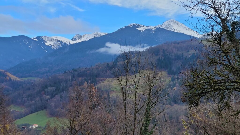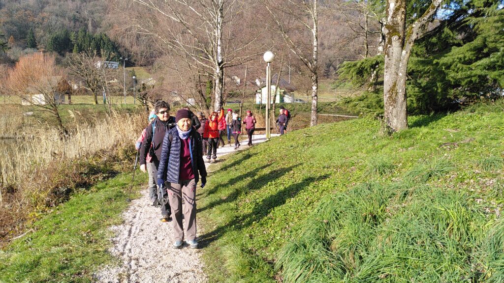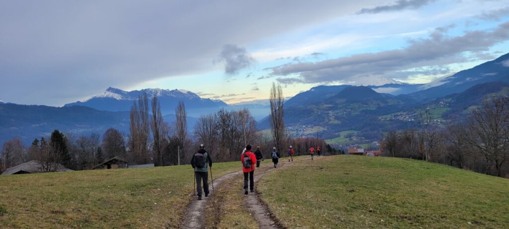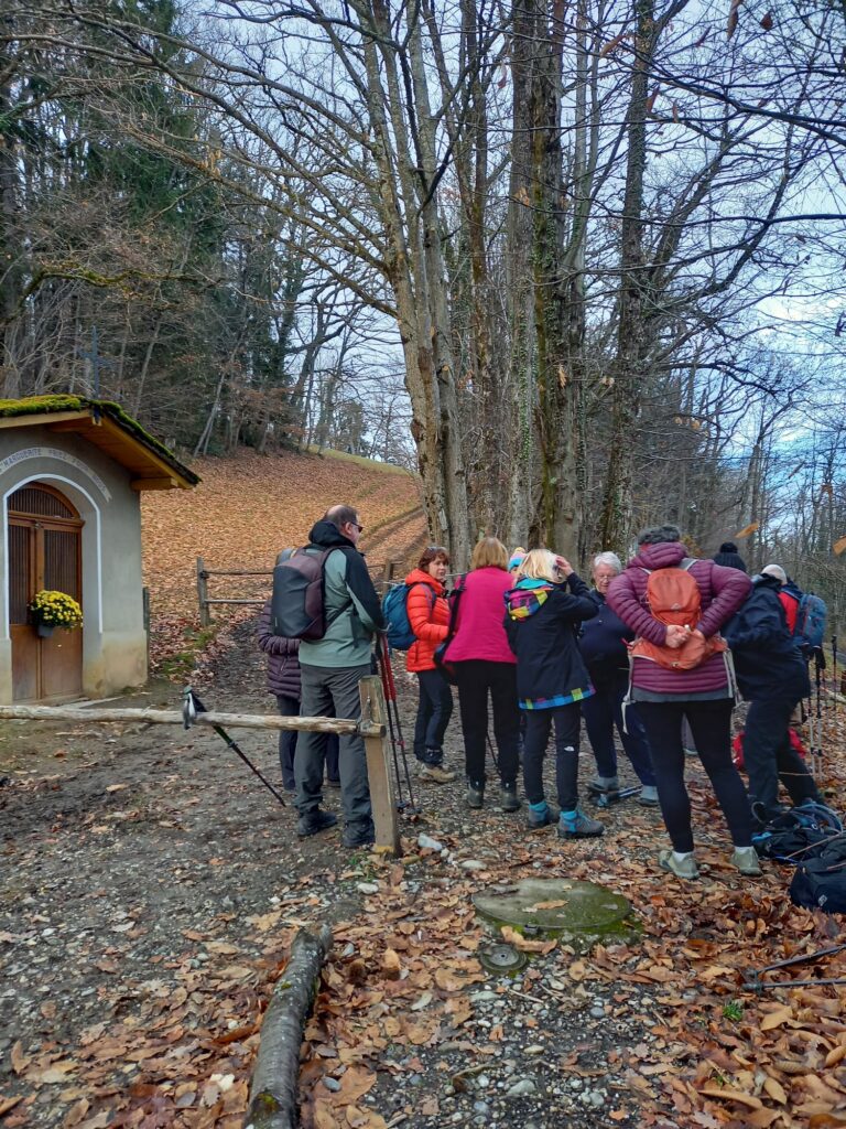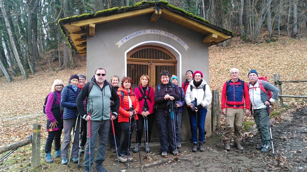 Nous étions 14 au départ de cette balade d’après-midi. Au départ nous avons eu du soleil pour contourner le lac de St Clair et ensuite traverser le petit village de Détrier. De là nous attaquons la montée en forêt sur un chemin assez large. La pente est assez relevée et régulière. Les nuages ont pris le dessus, ce qui ne nous empêchent pas d’admirer les sommets enneigés des Belledonnes : les Grands Moulins, la pointe du Rognier, etc … . Après 350 m de dénivelé positif nous arrivons à la chapelle Ste Marguerite. Nous n’avons pas accès au Mt Pézard, car le terrain est privé, et le chemin bien clos. Nous avons d’ailleurs croisé le propriétaire, un personnage bien mal léché, qui nous a fait comprendre que l’on n’était pas les bienvenus et qui a voulu nous intimider avec son tracteur. Bref, nous avons entamé notre descente, moins pentue que la montée, mais avec plus de portions goudronnées. Après être passés à Arvillard, nous avons retrouvé Détrier, puis le parking du lac. Il était temps car la nuit arrive.